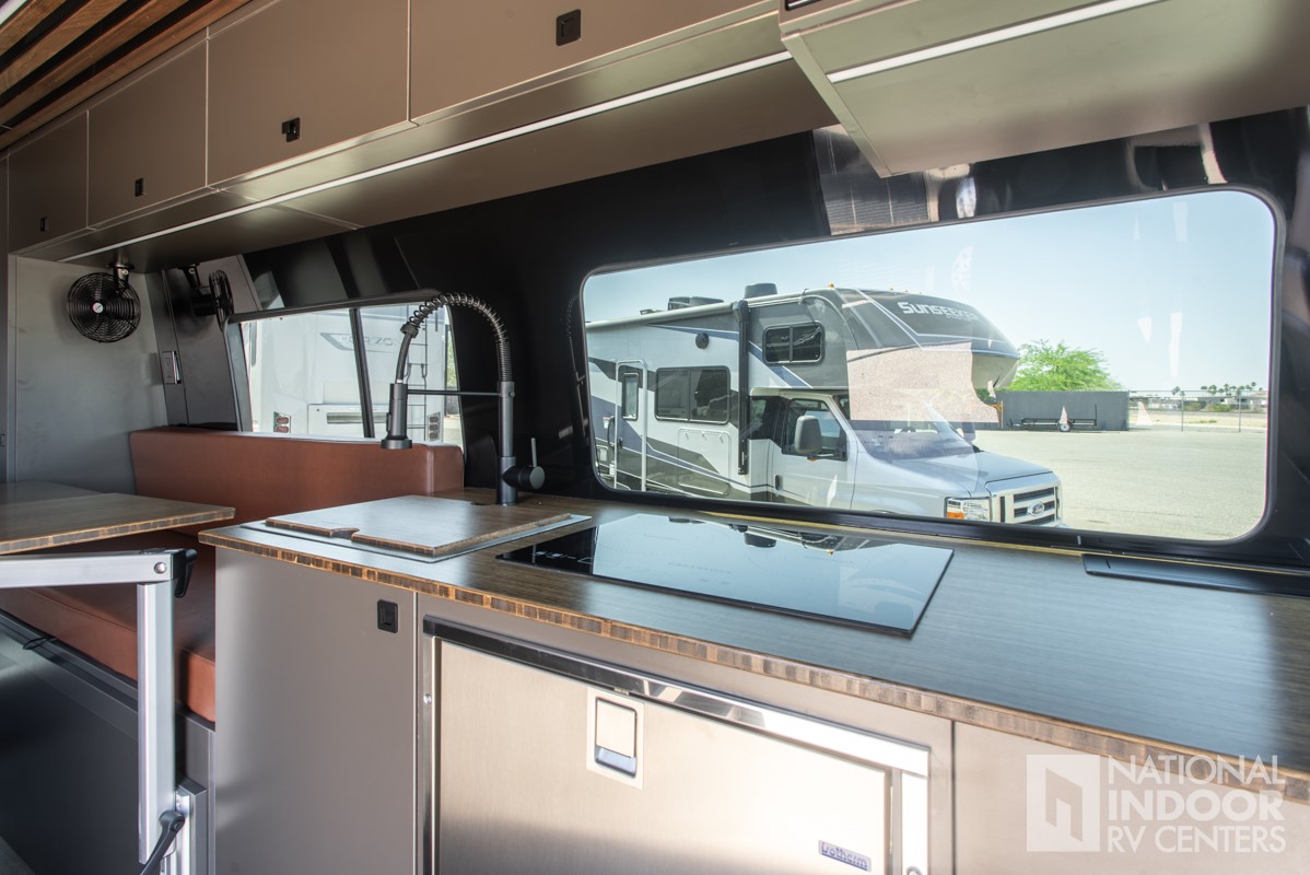• The interior of the 170" WB Venture van is outfitted with a leather dinette to bed conversion, laguna dining tables, wood paneling and LED accent lighting. The overhead shelves store your hiking gear, and bug screens keep bugs at bay during outdoor adventures.