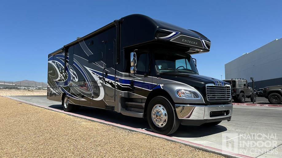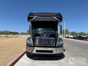 | E-Z Drive Premier, one-piece seamless fiberglass front and rear caps, automotive-bonded panoramic window in front cap with power shade, dual-pane tinted safety-glass windows, 15K AC with heat pump and 13.5K AC, electric patio awning with LED lights, 2,000-watt pure sine wave inverter, power cord reel with 50 amp service, 10-gal. gas/electric water heater, Sony infotainment center, backup and side-view cameras, 21-cu.ft. refrigerator, convection microwave |
