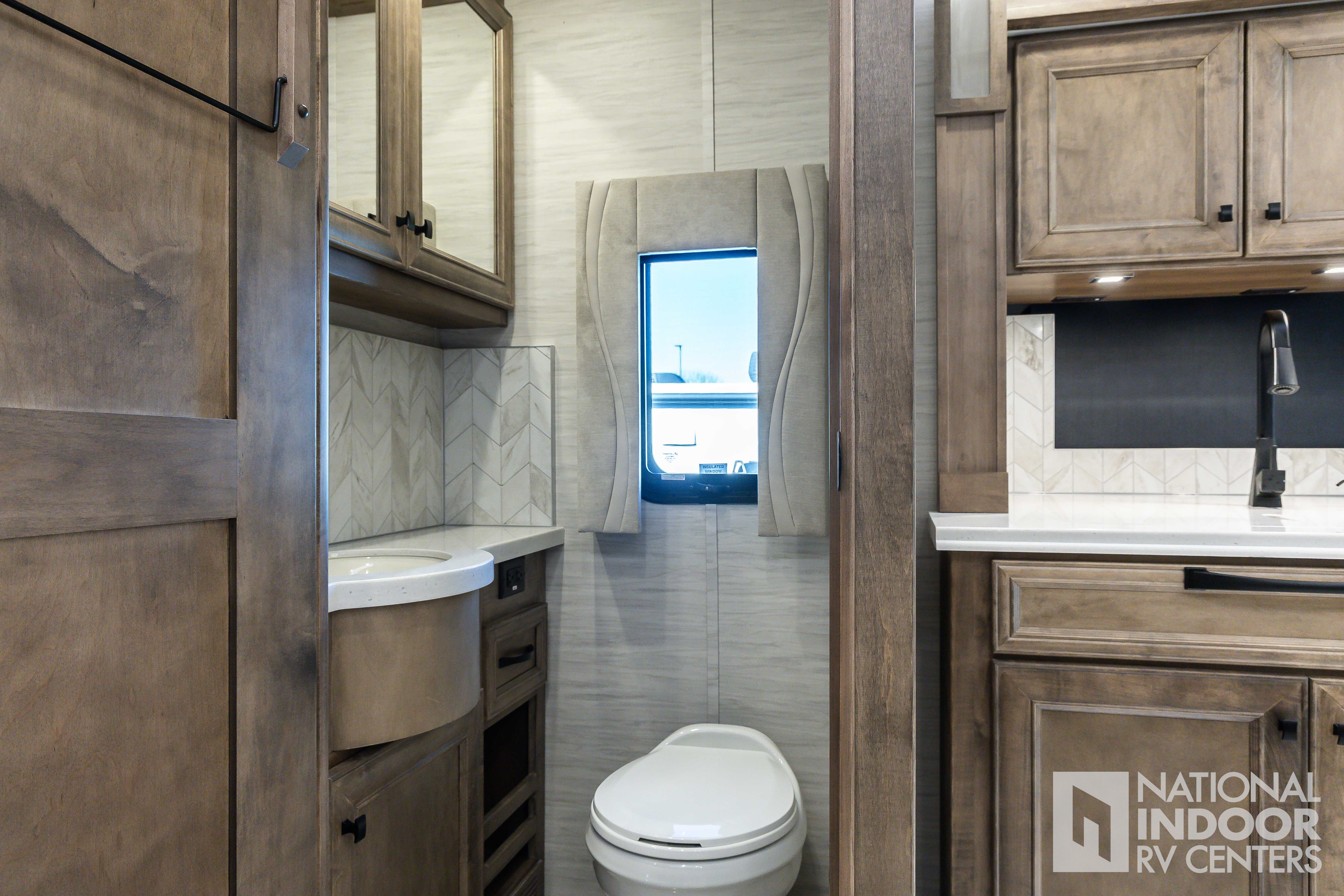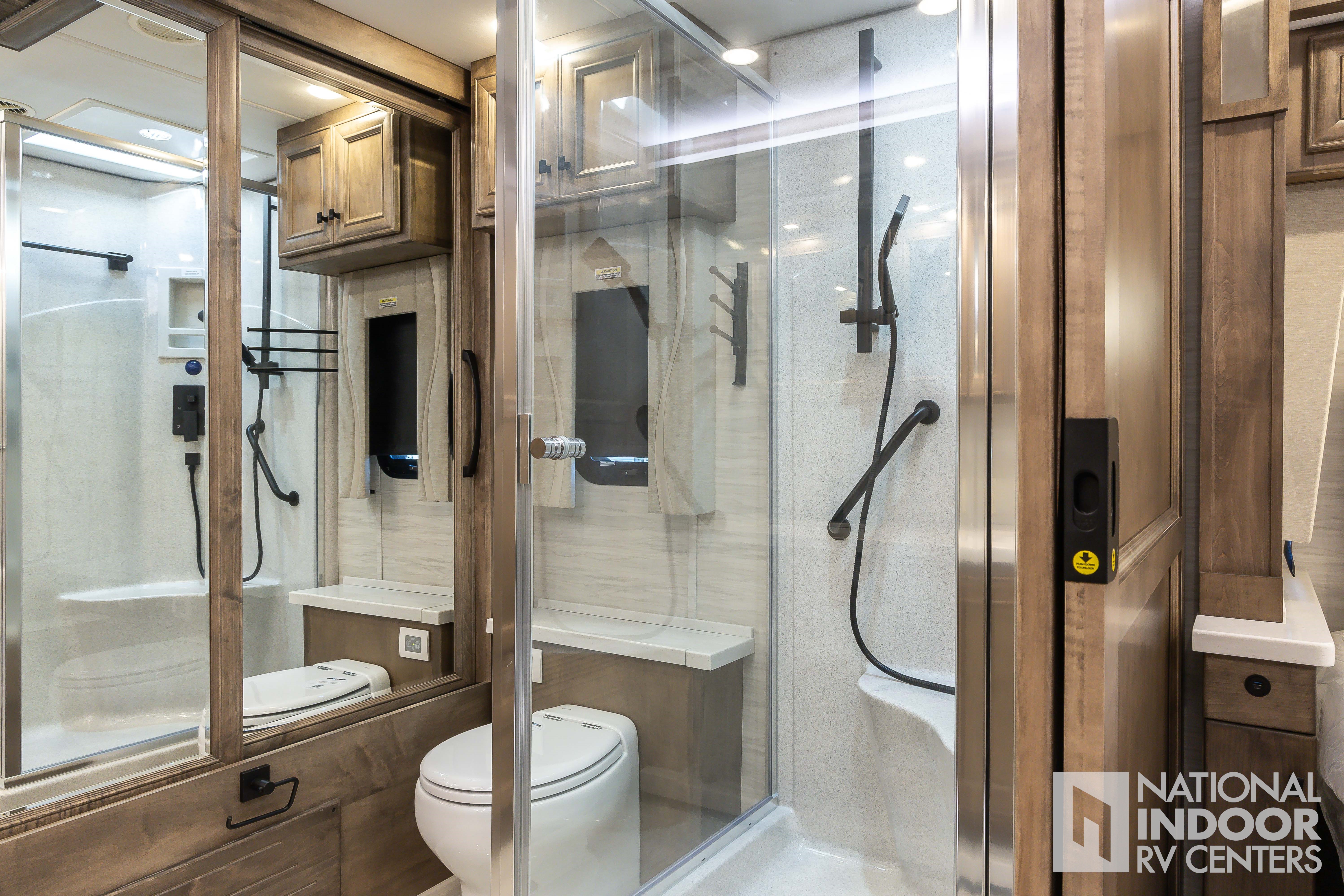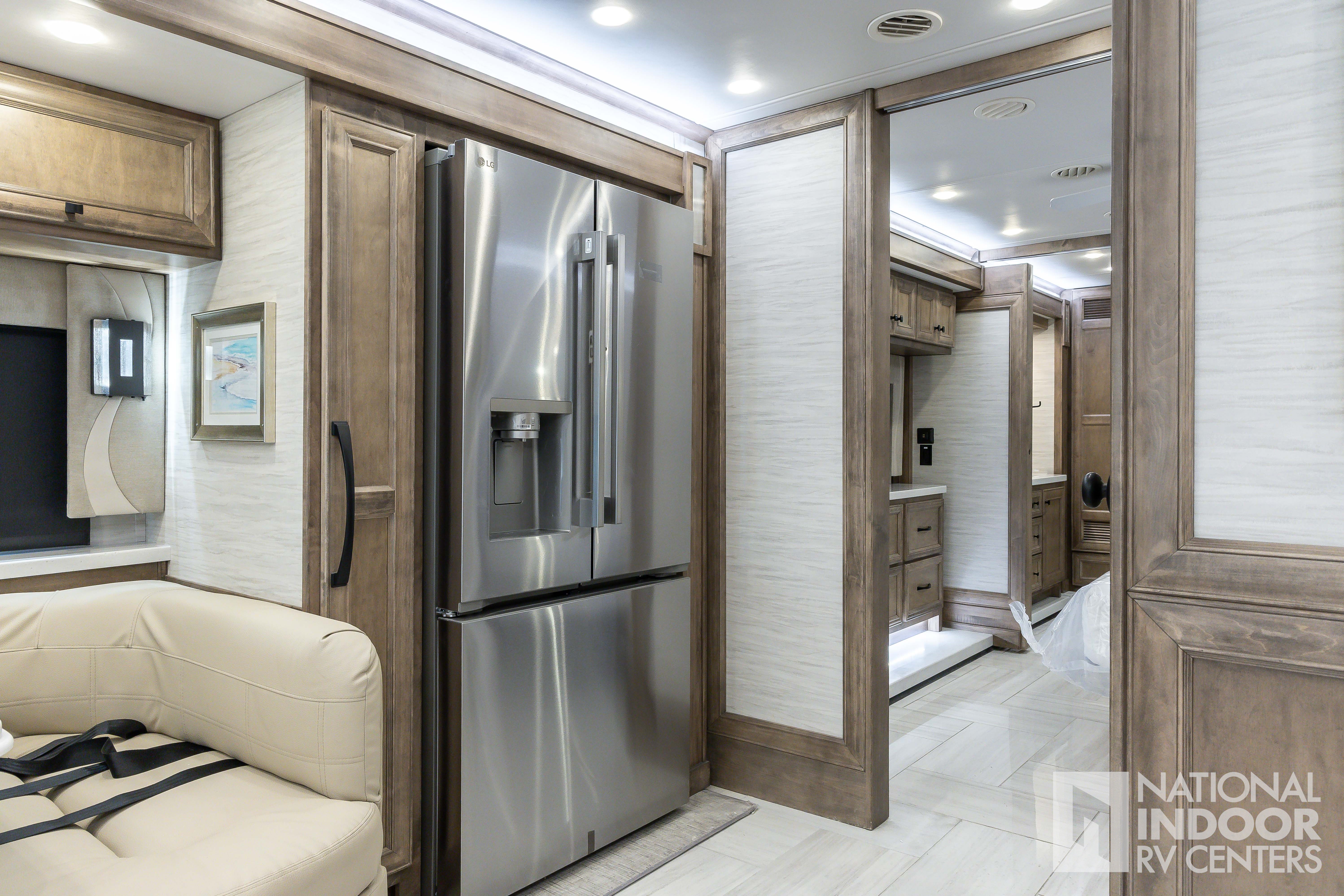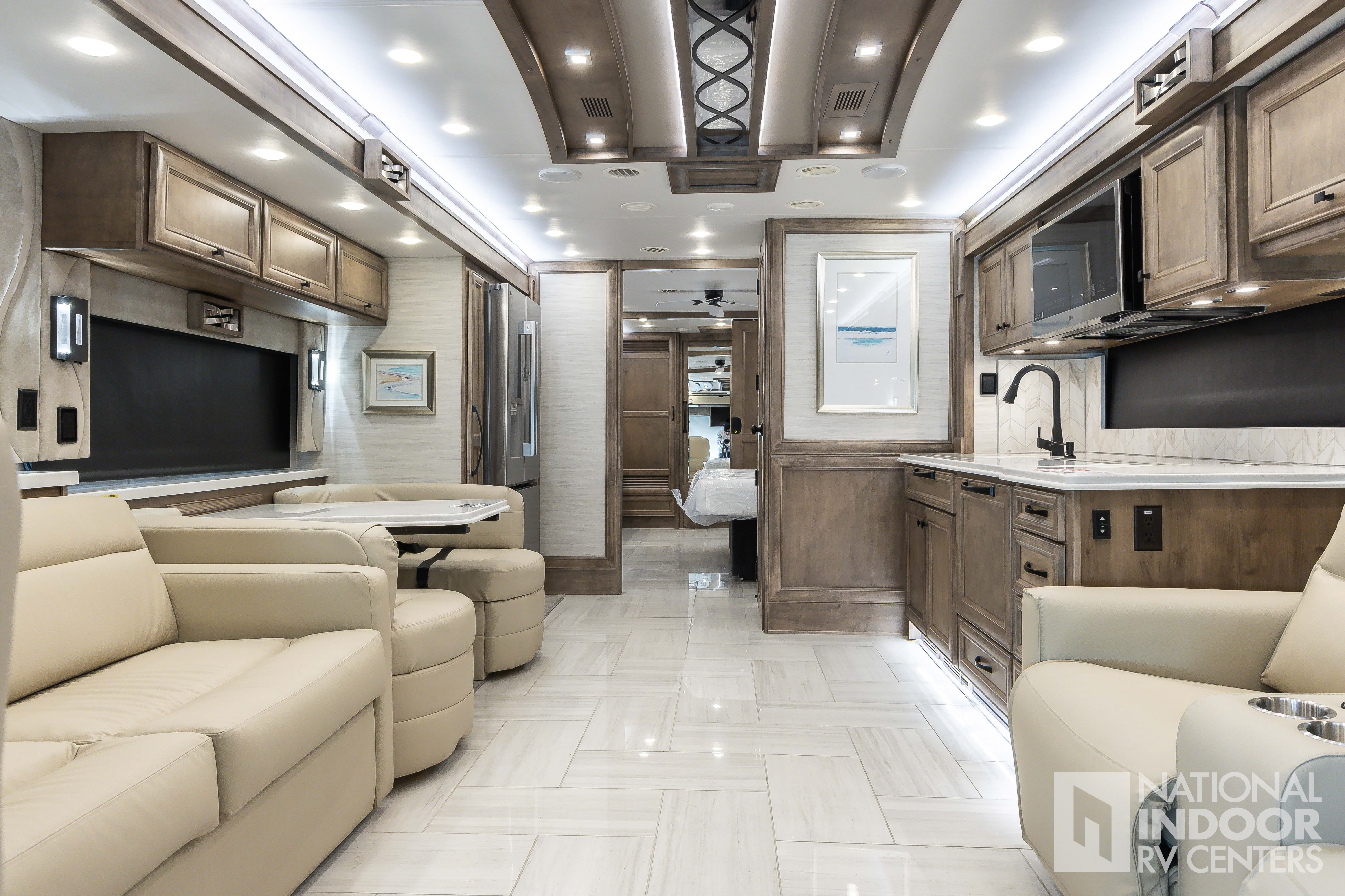 King Bed, Residential Refrigerator & Microwave, Freightliner PowerGlide® XC Raised Rail Rear Engine Diesel Chassis!