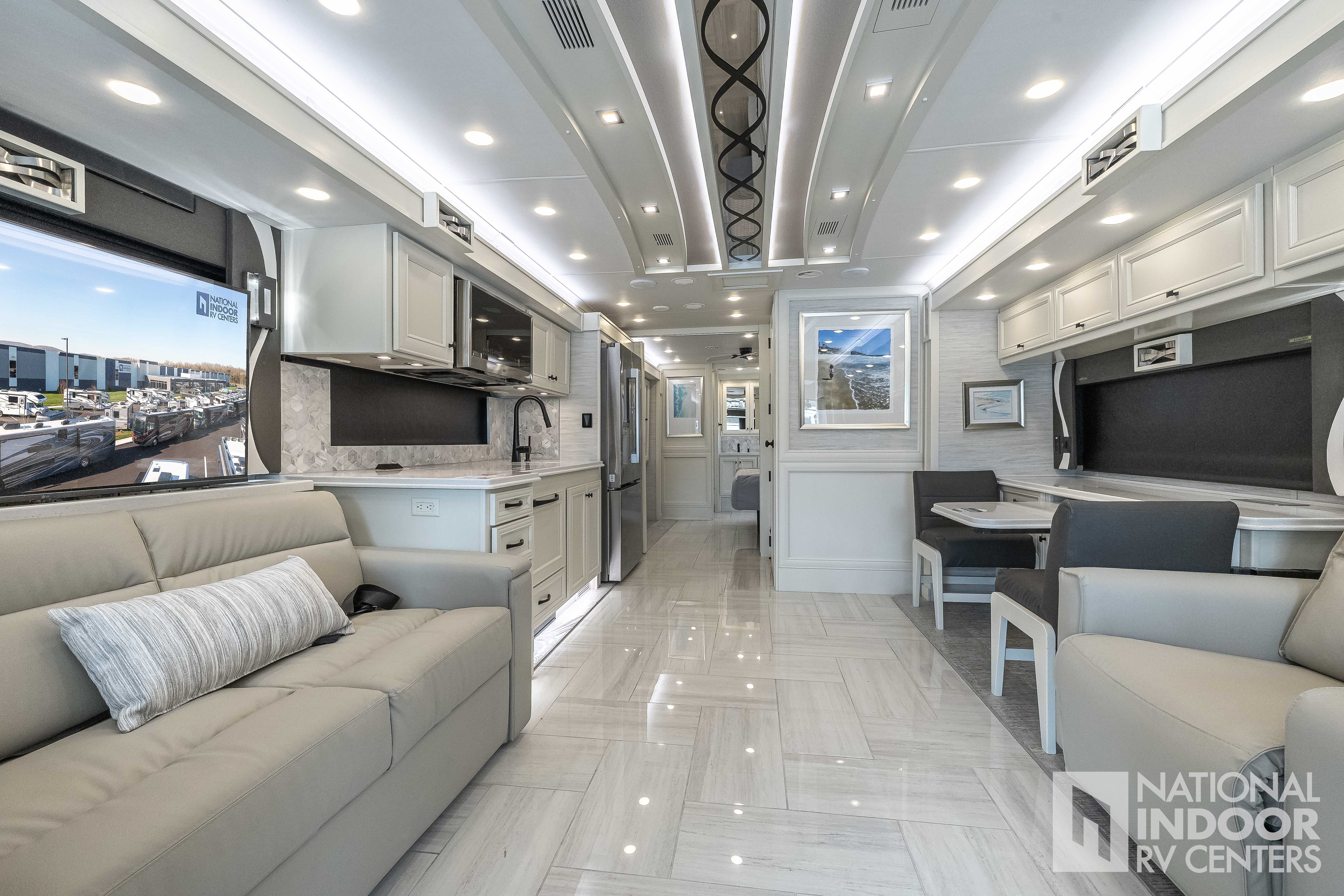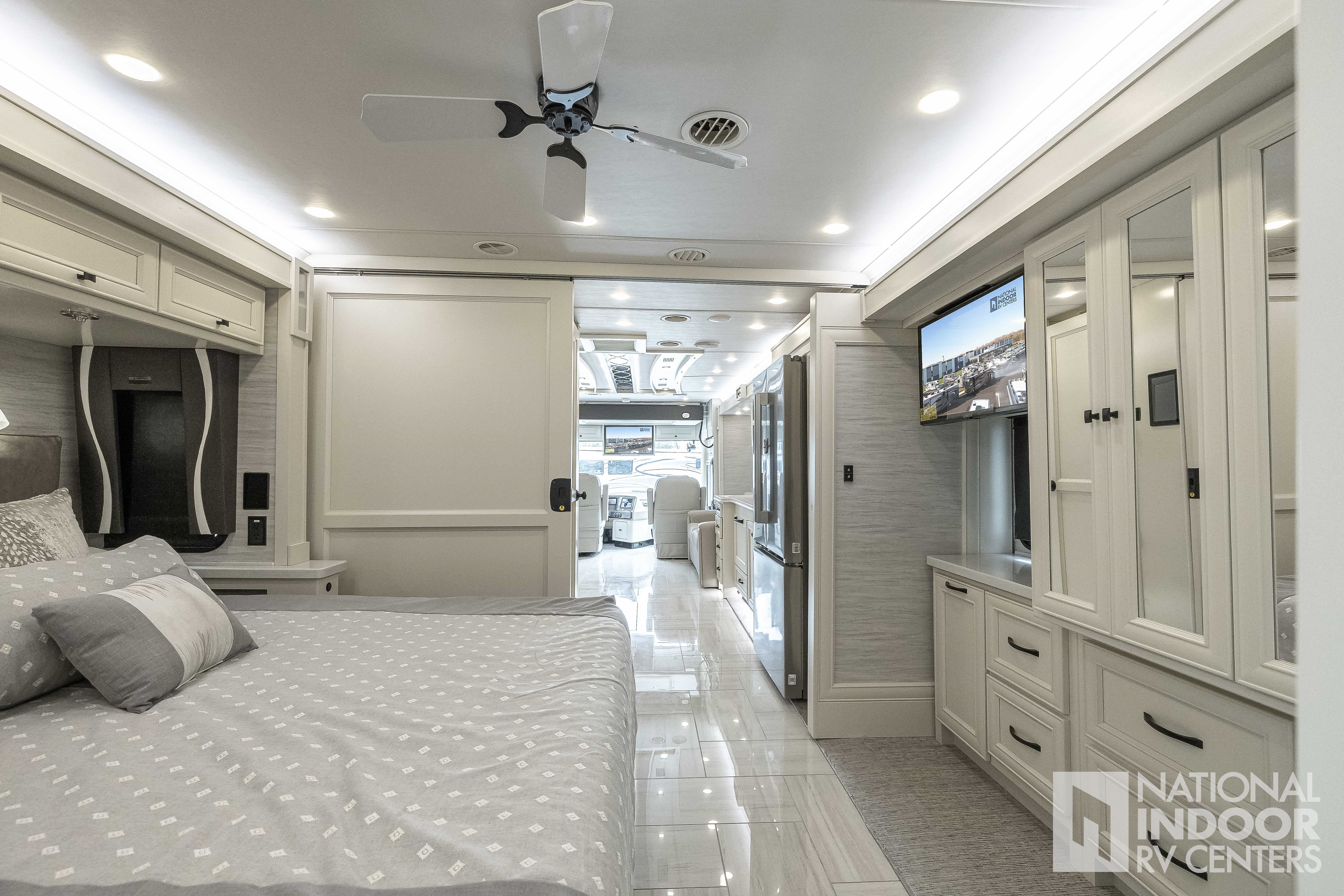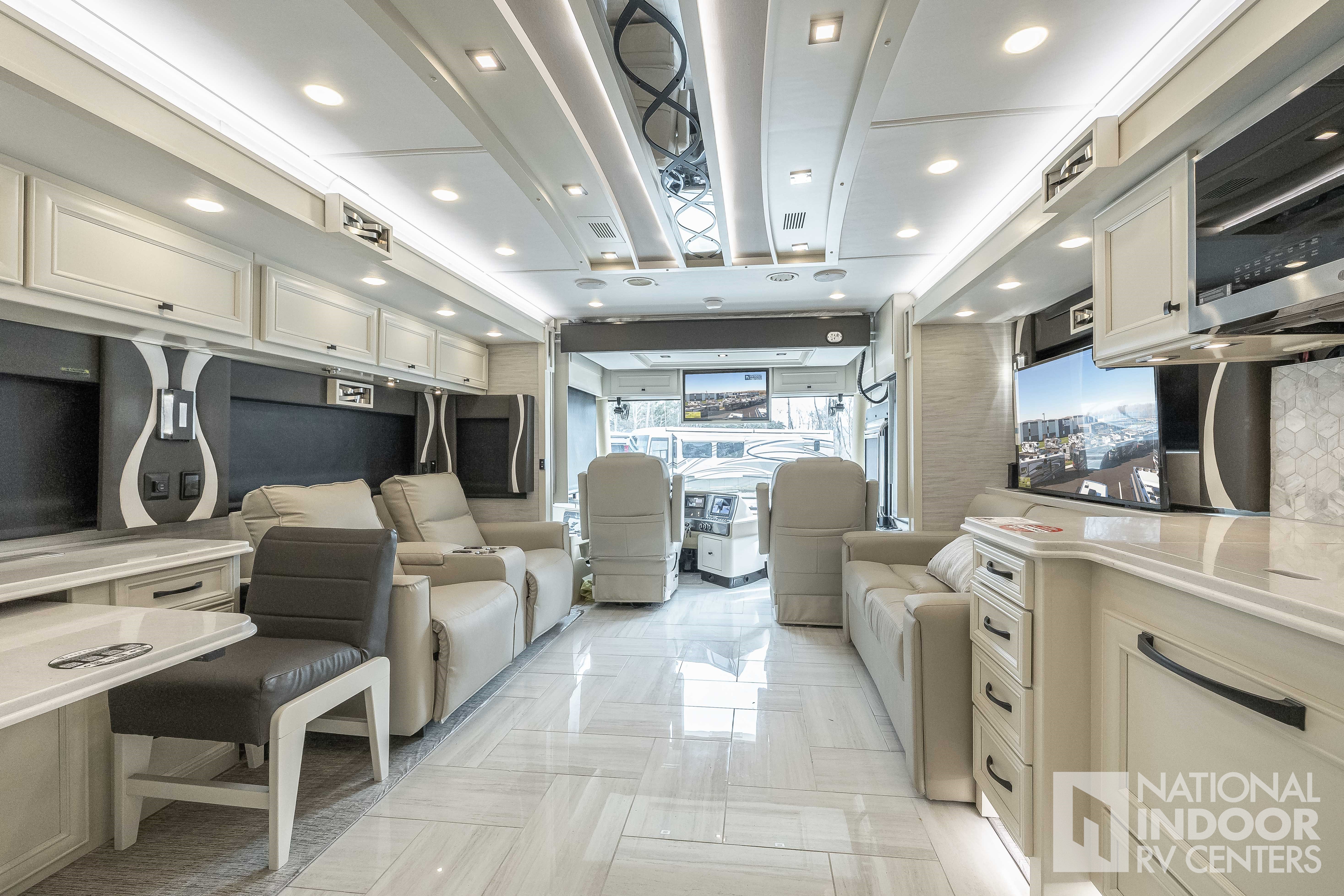 King Bed, Residential Refrigerator & Microwave, Freightliner PowerGlide® XC Raised Rail Rear Engine Diesel Chassis!