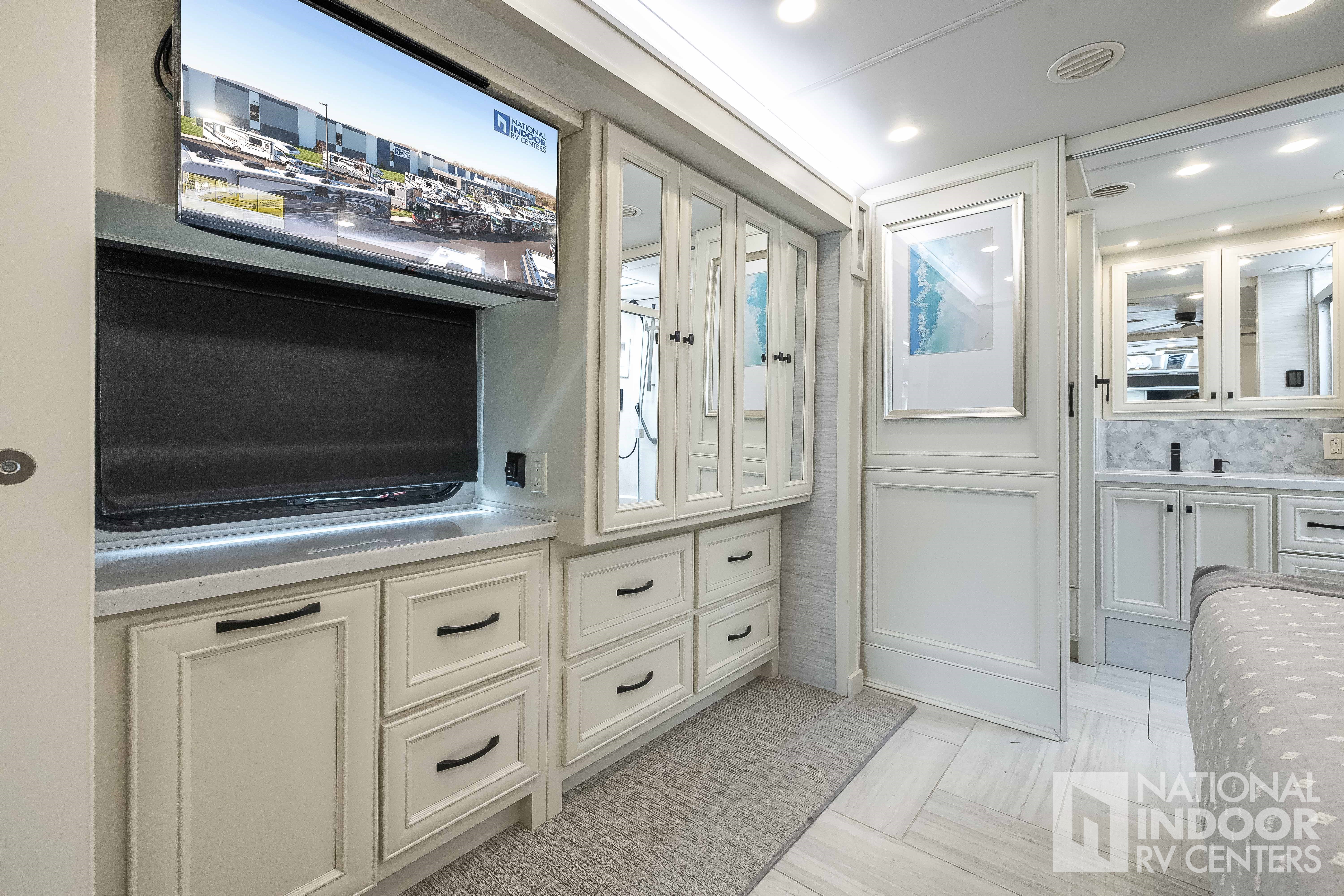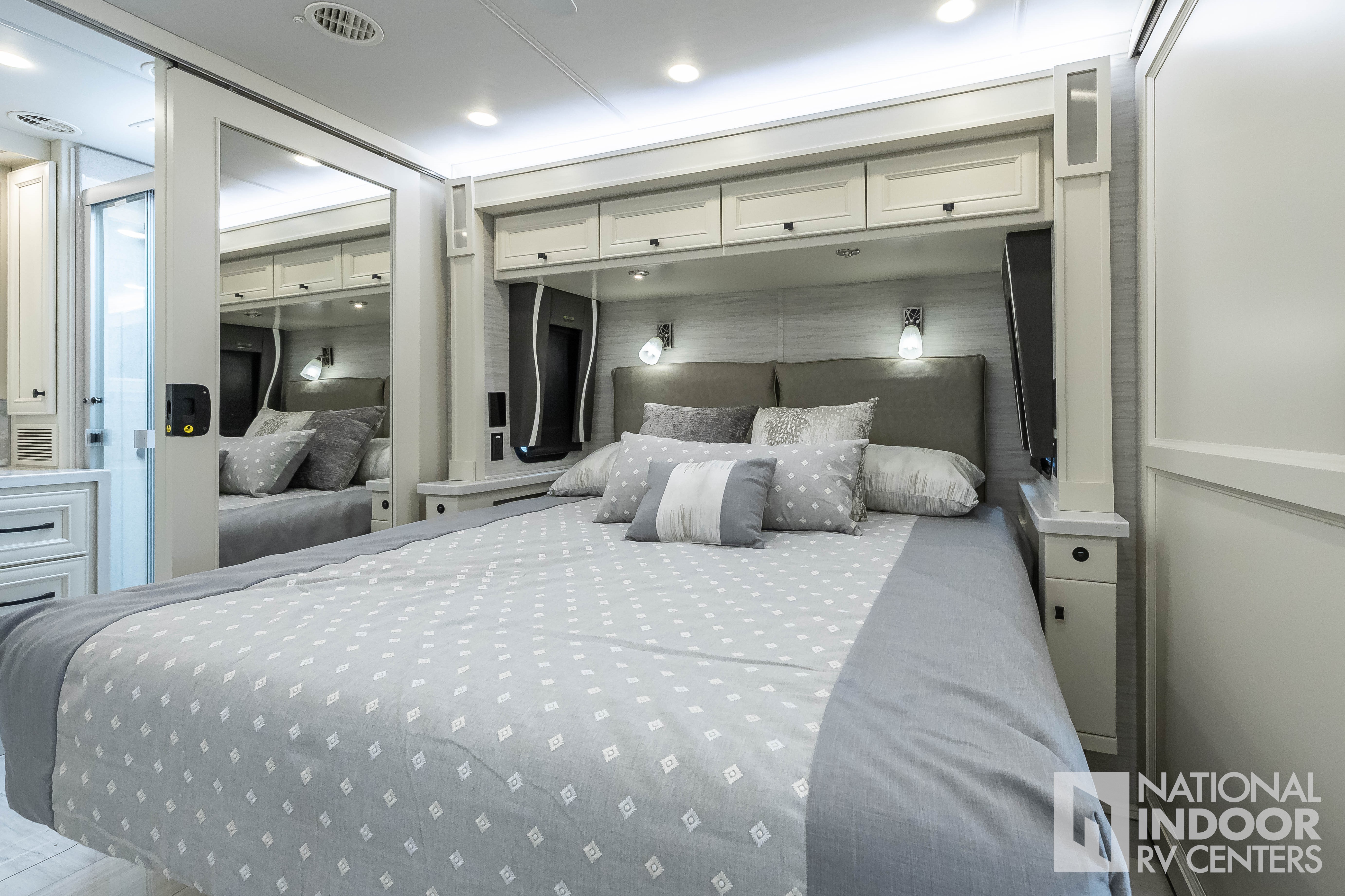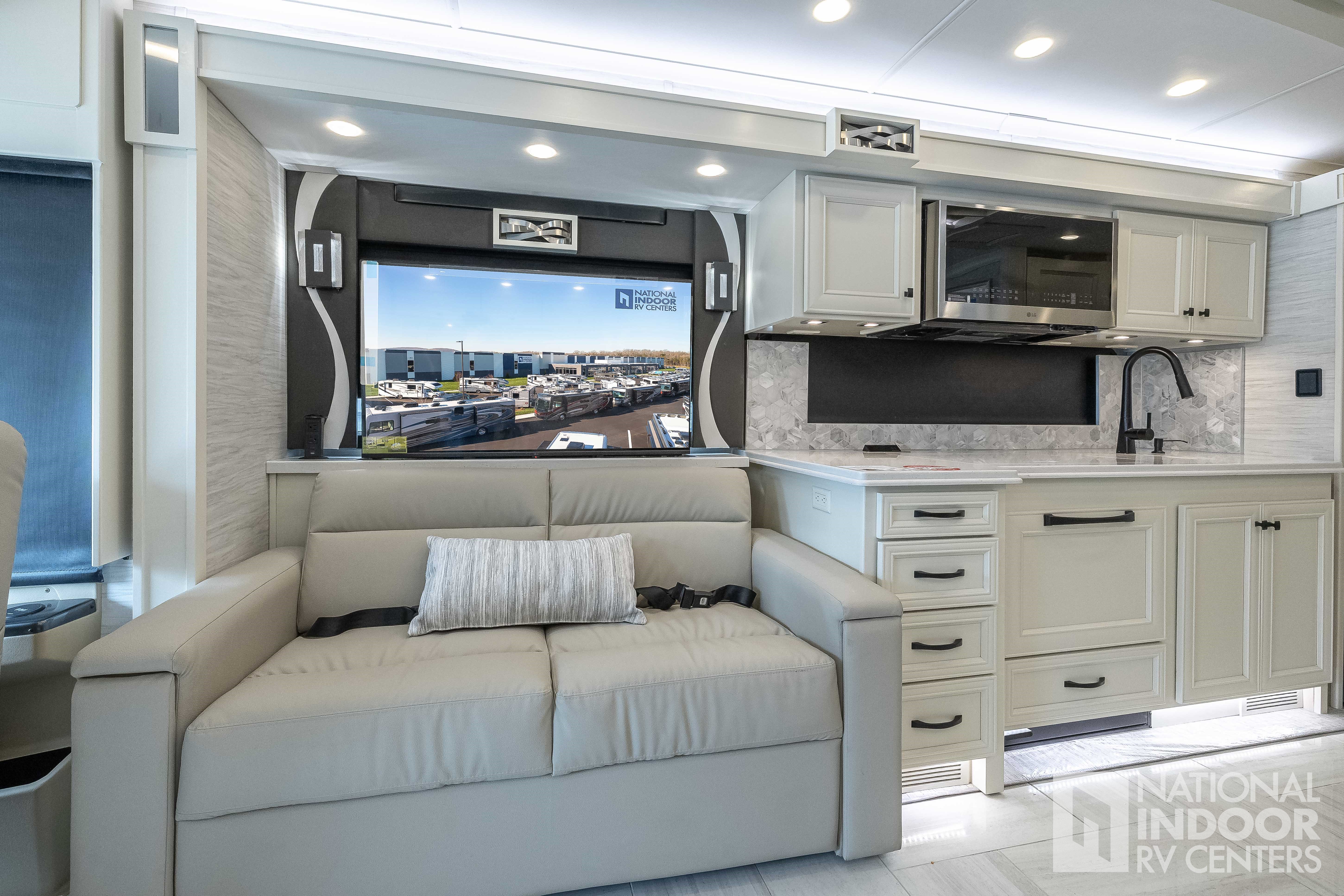 King Bed, Residential Refrigerator & Microwave, Freightliner PowerGlide® XC Raised Rail Rear Engine Diesel Chassis!