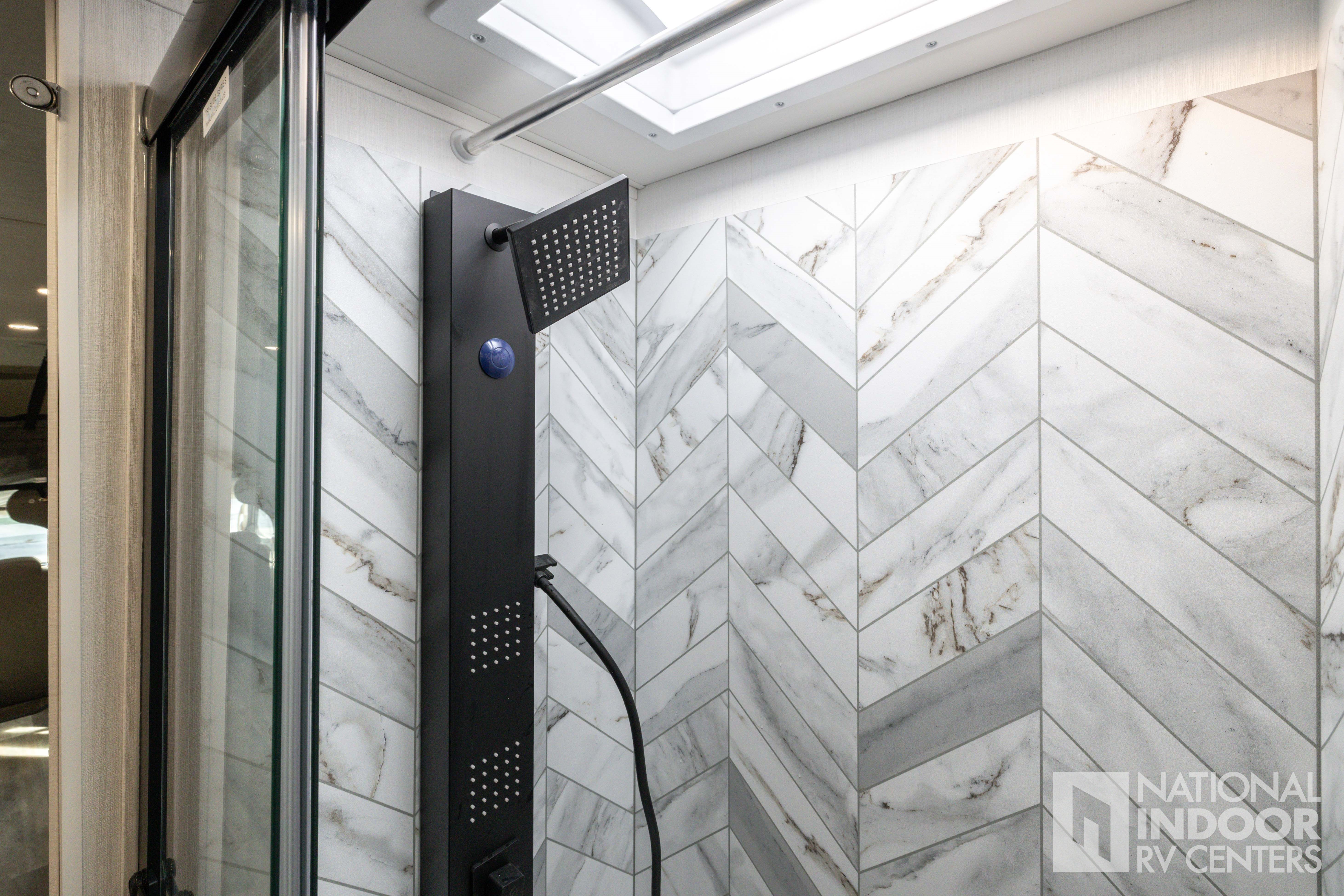 • Shower with decorative surround, glass door, skylight and light