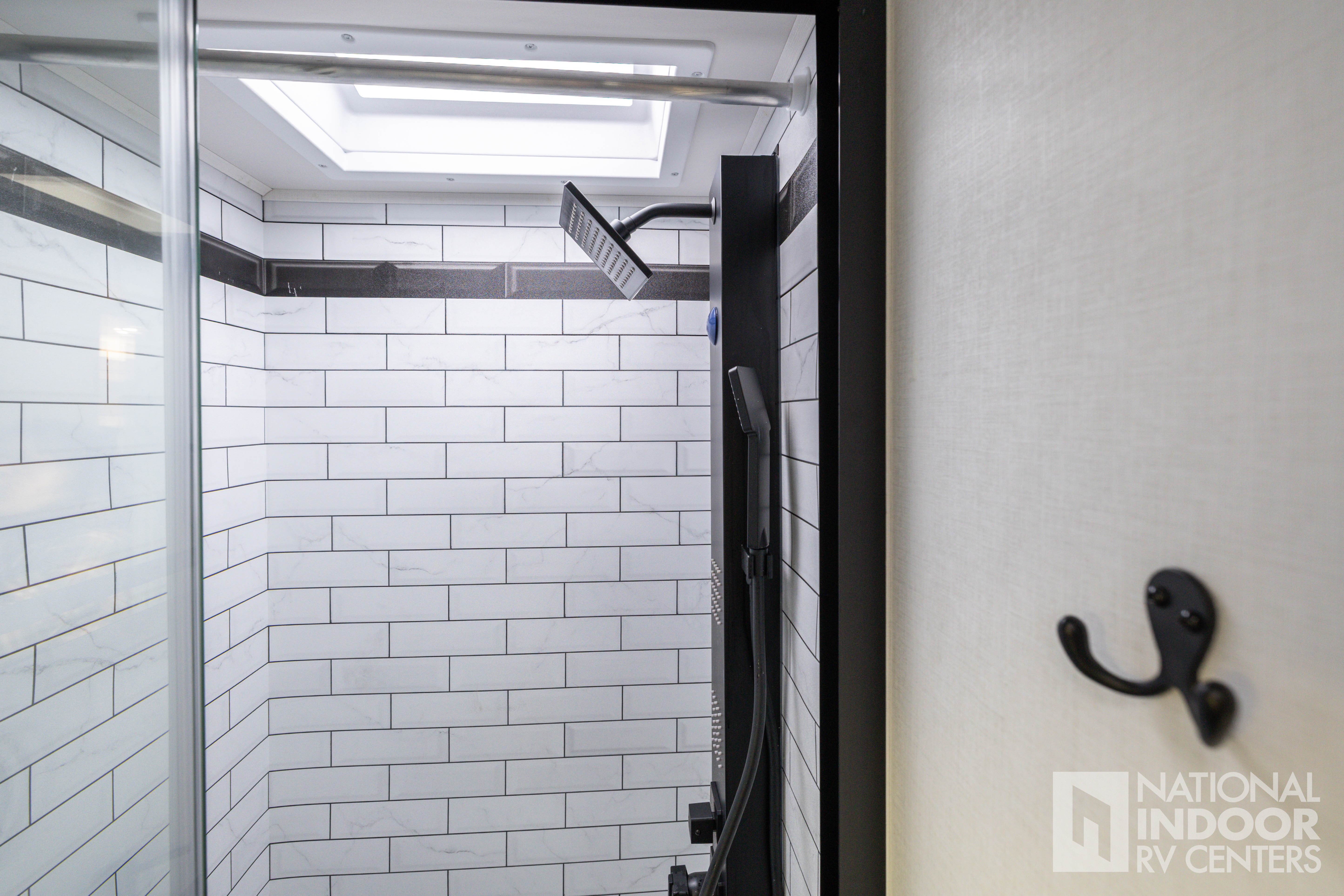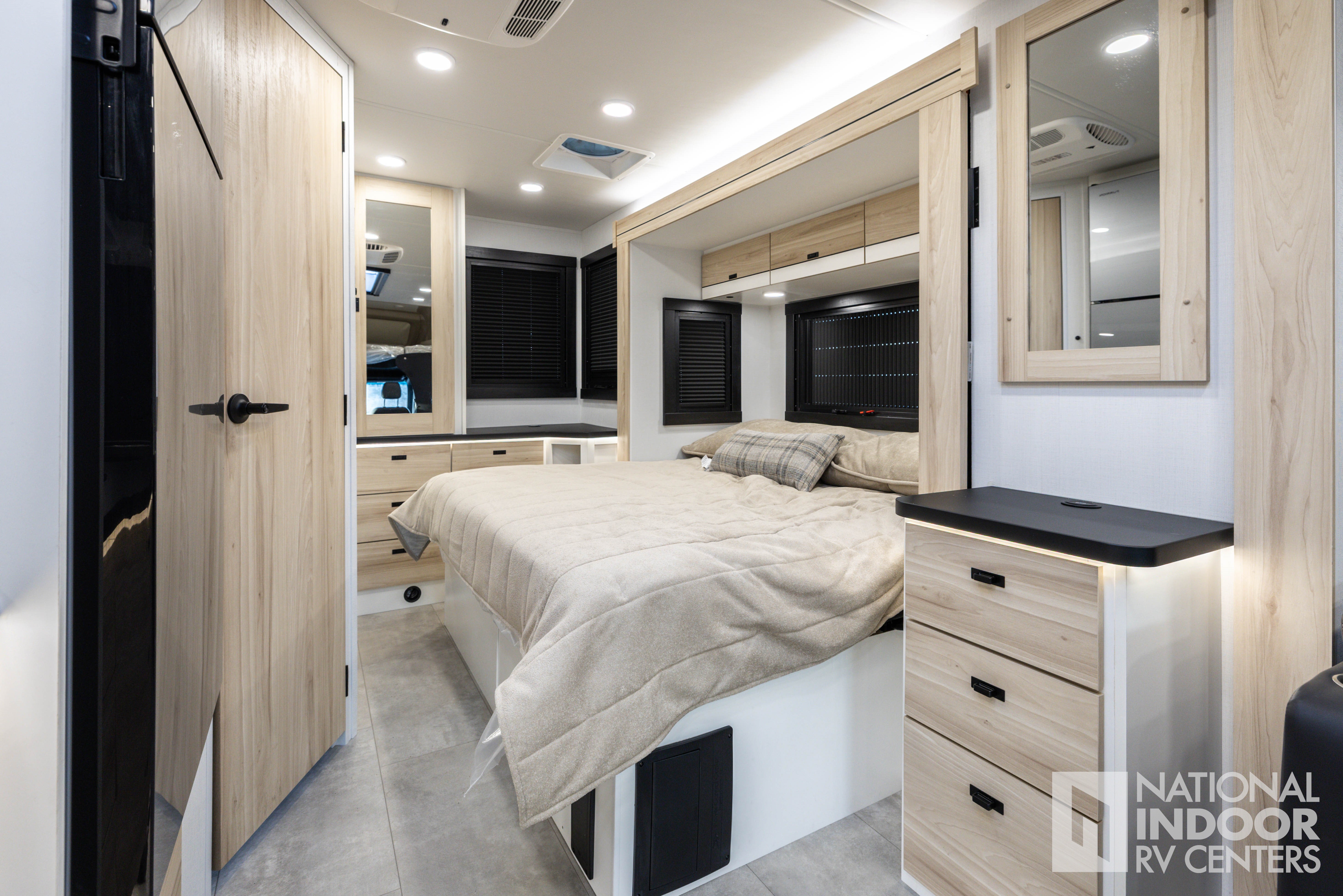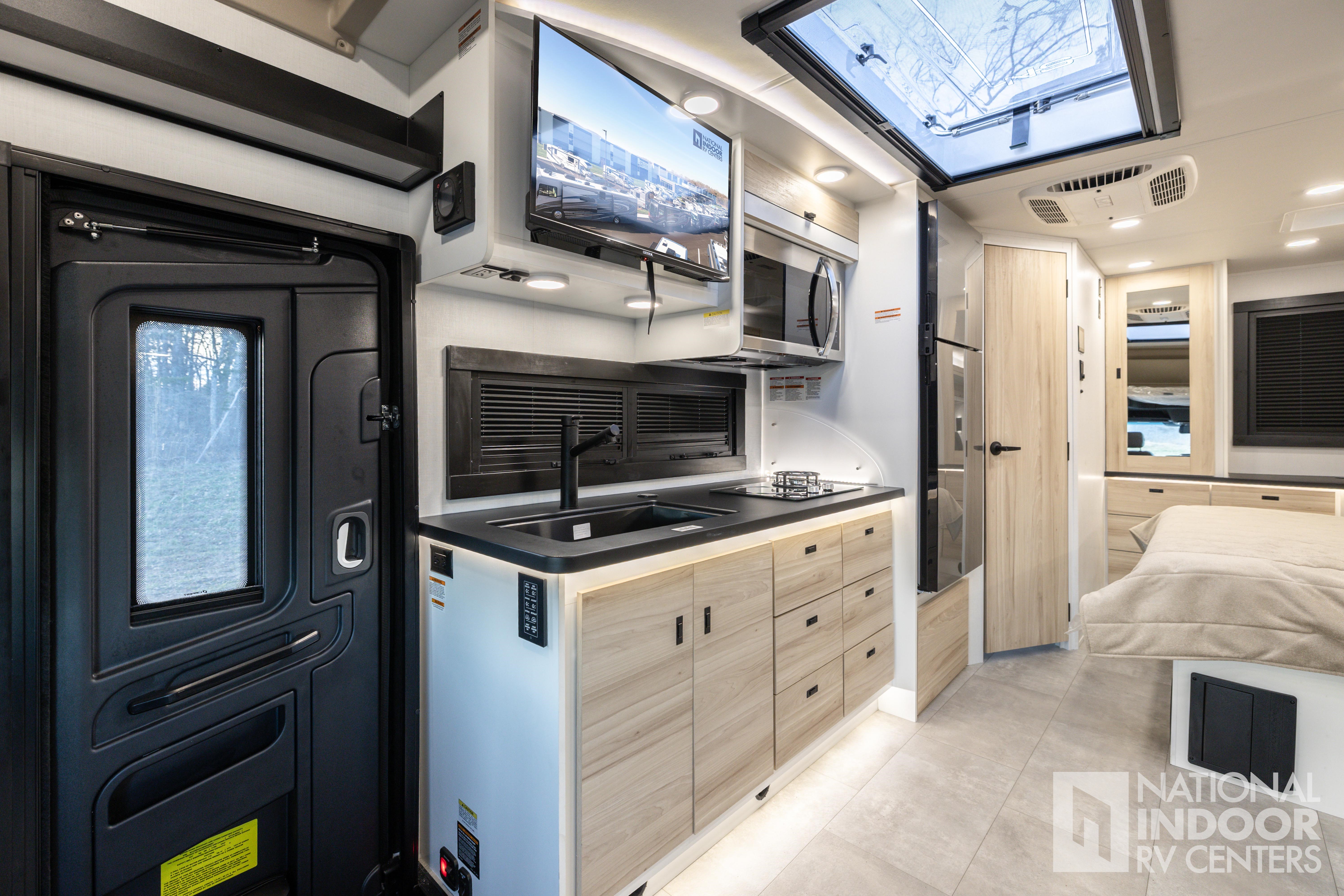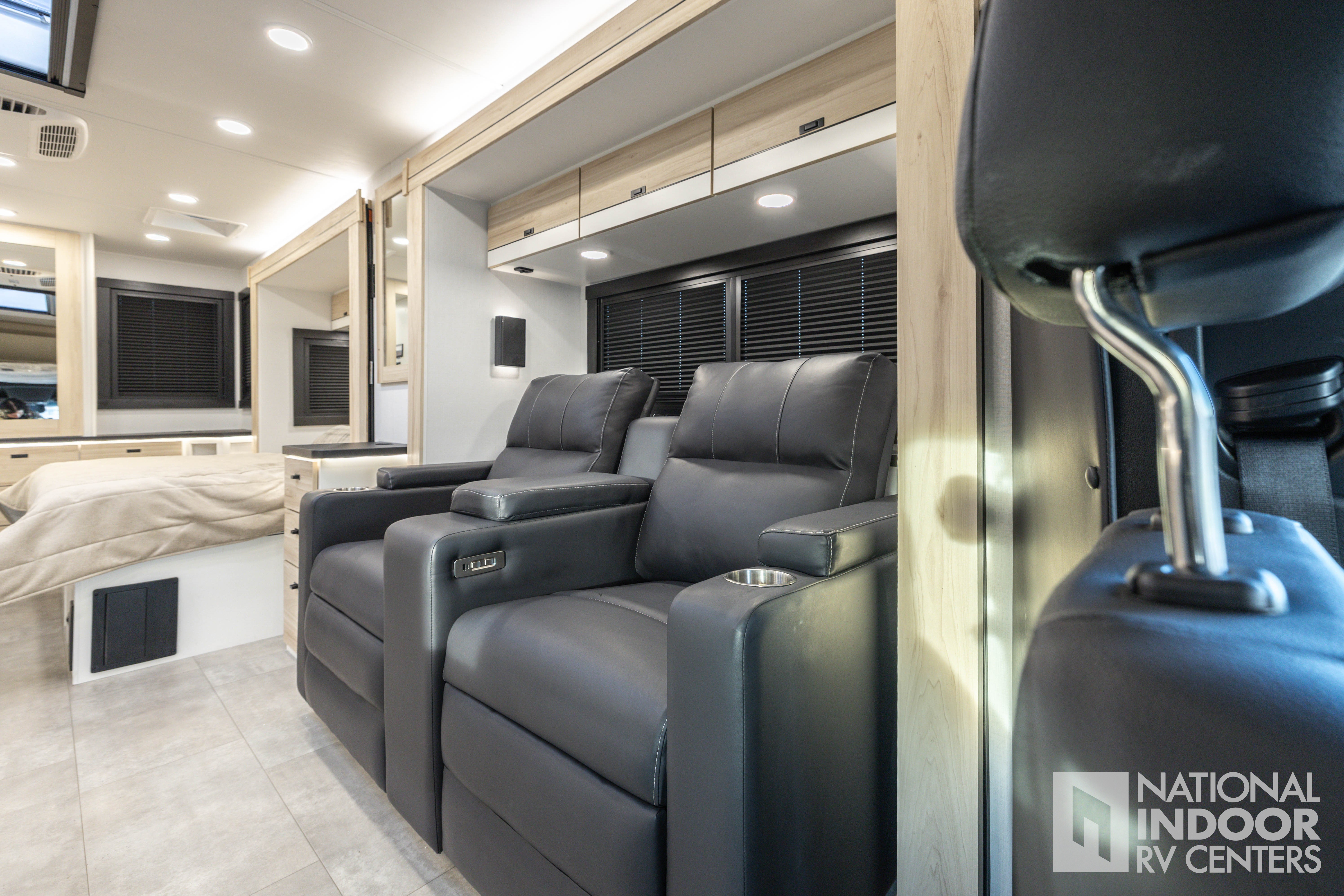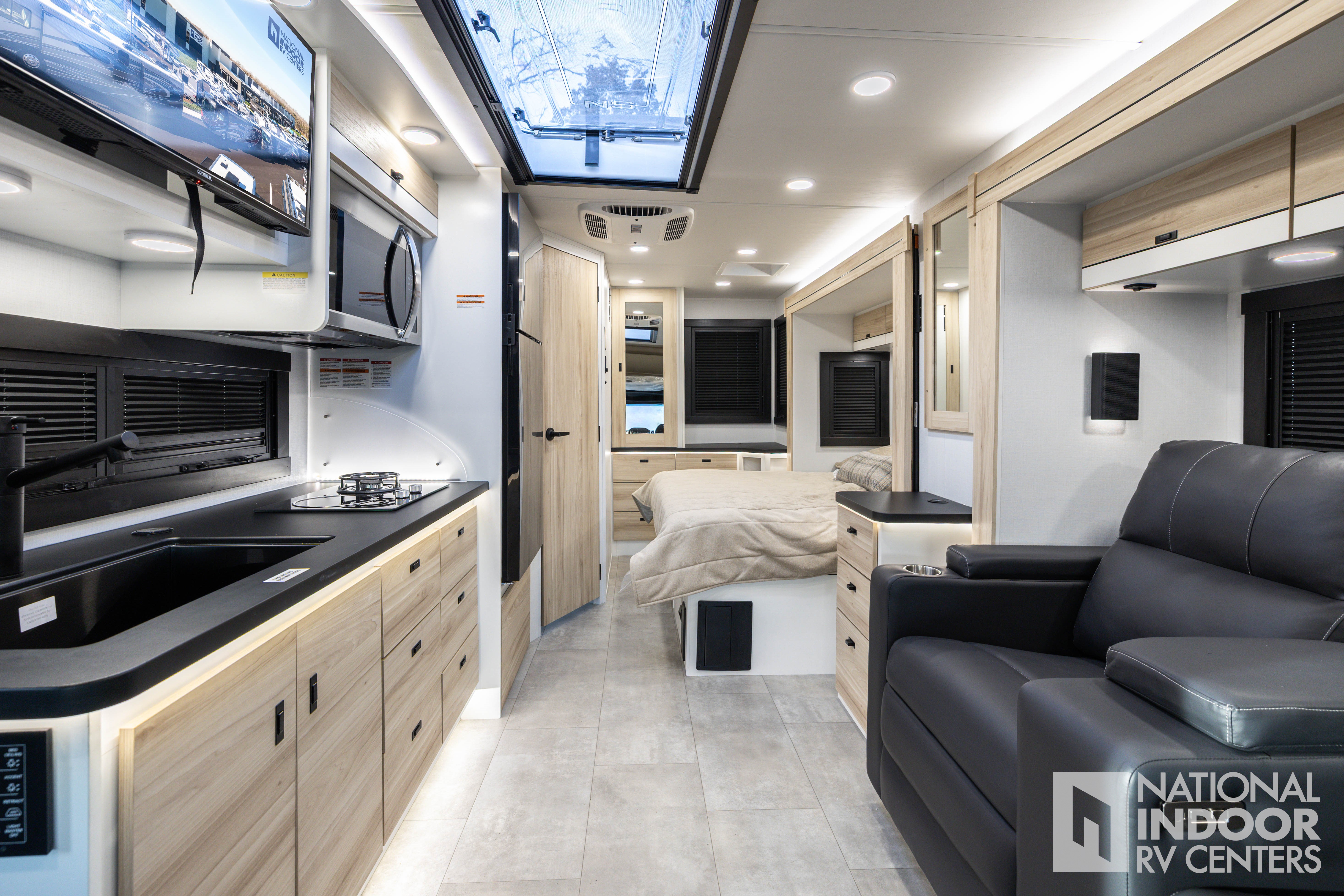 • One-piece, seamless fiberglass front cap; Automotive-bonded panoramic window in front cap with power shade; *Partial fiberglass rear cap