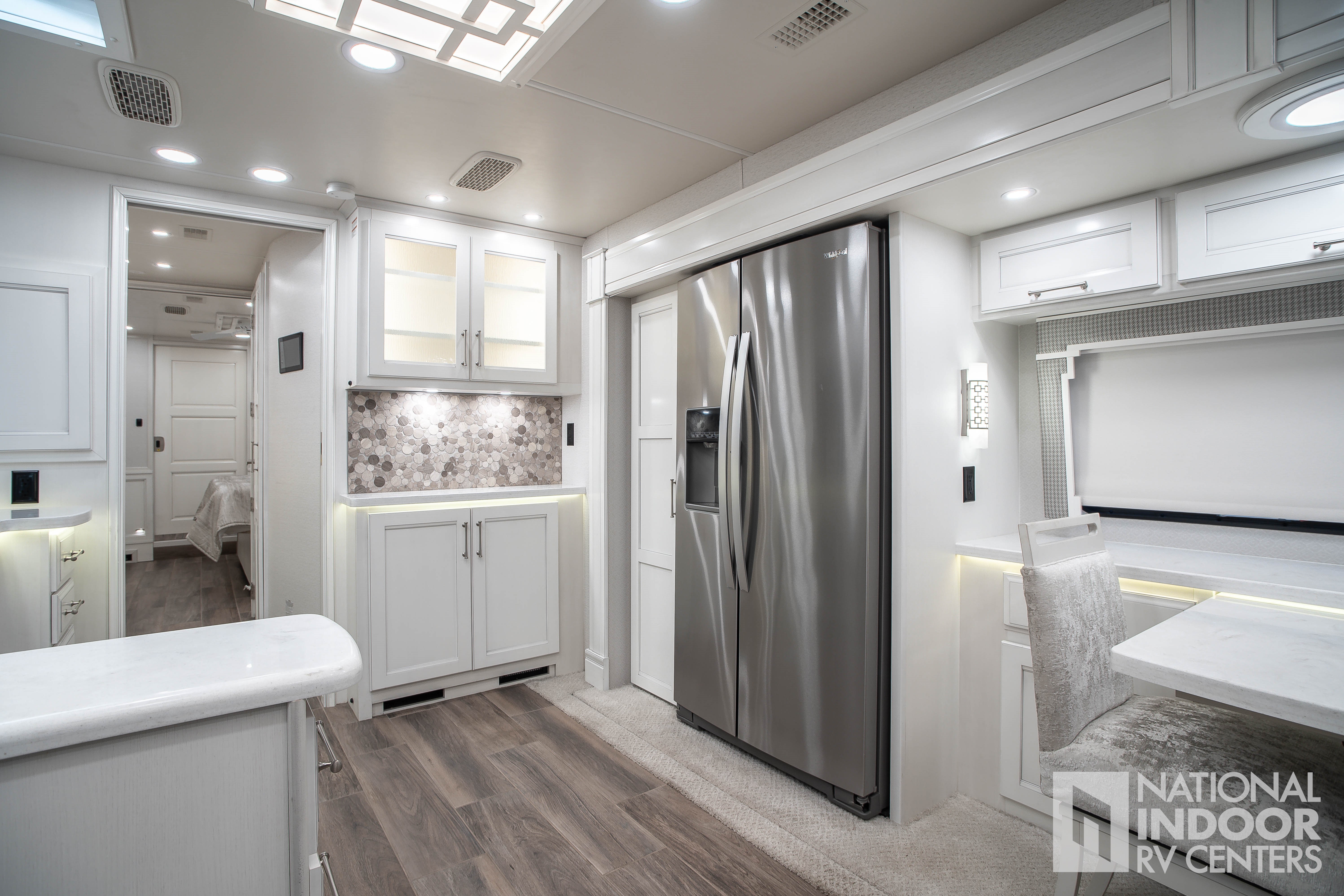 Bar area with beverage chiller and rain glass upper cabinet door with LED accent lighting (44R only)