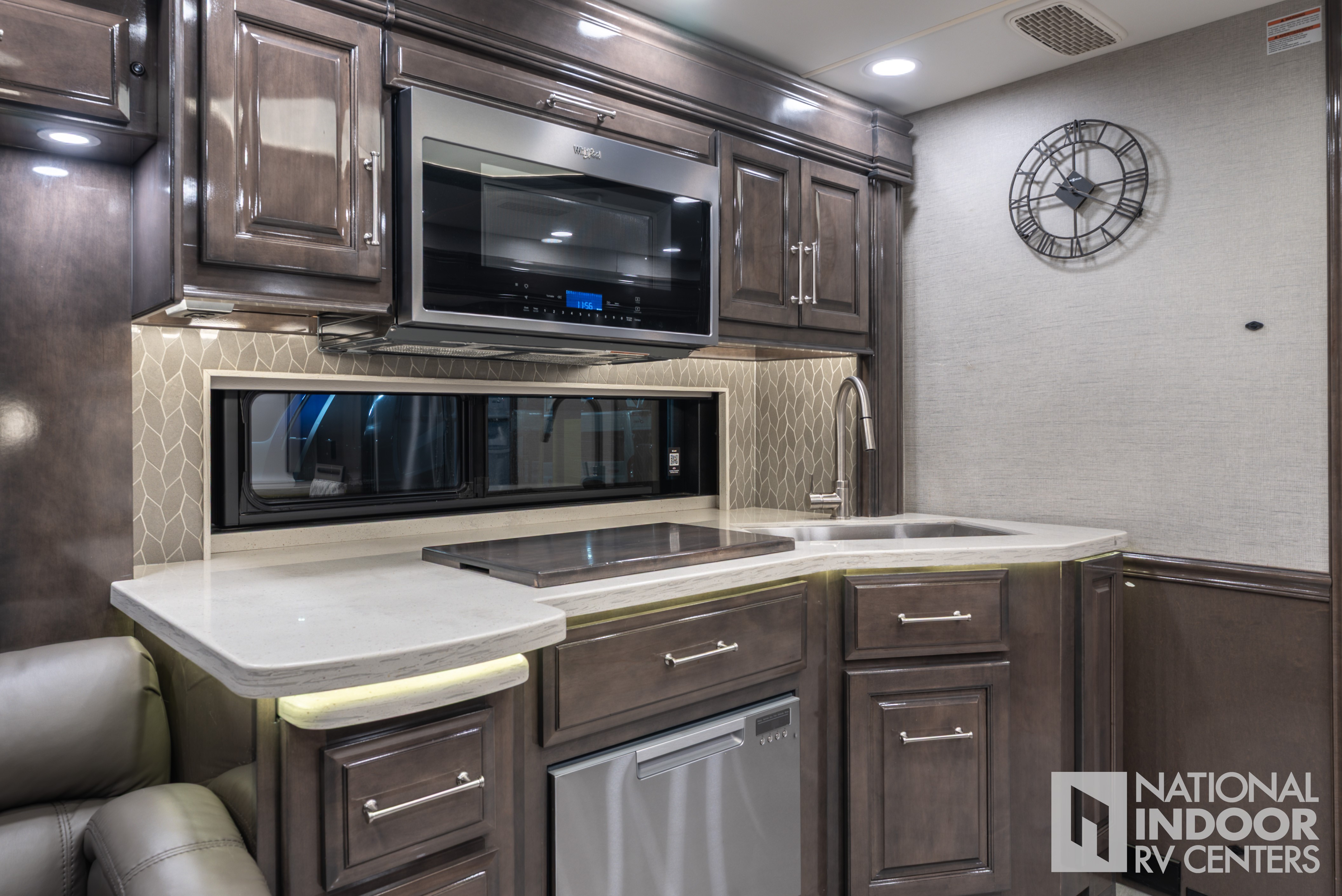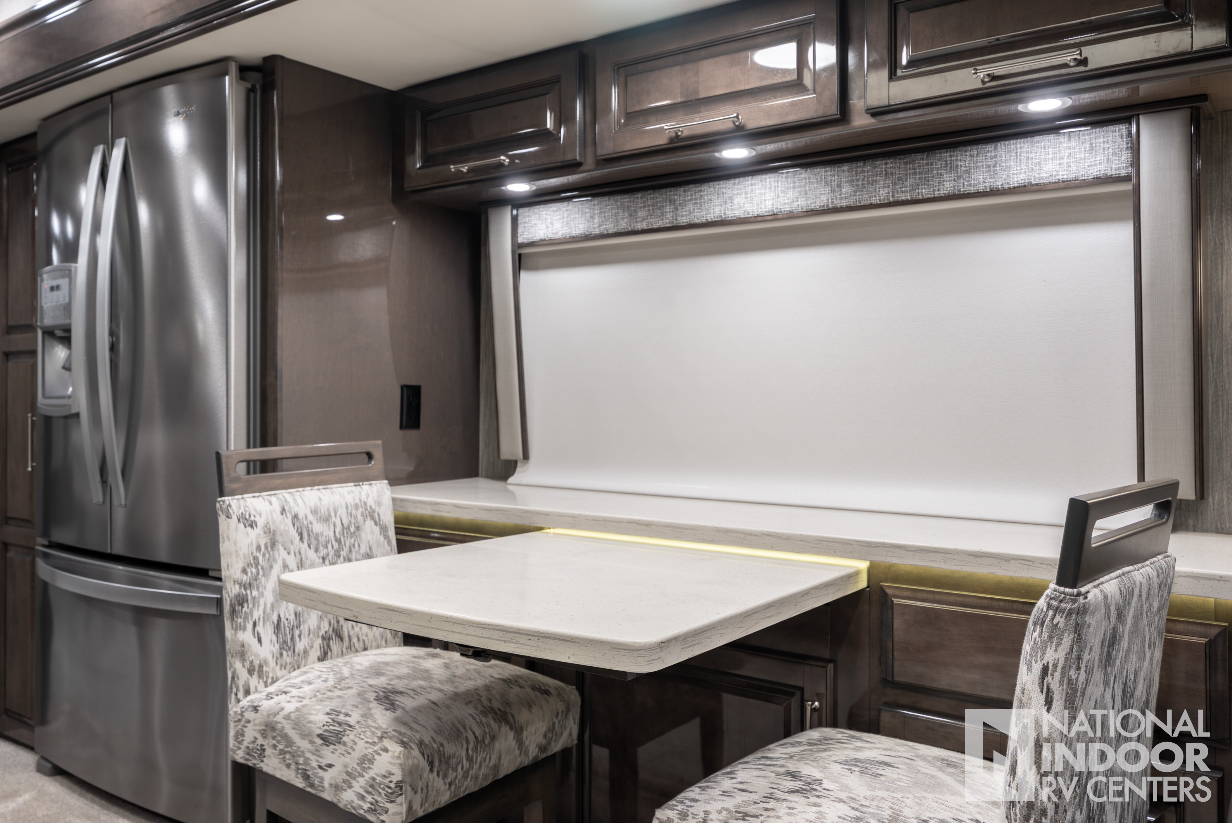| Bar area with beverage chiller and rain glass upper cabinet door with LED accent lighting (44R only) |