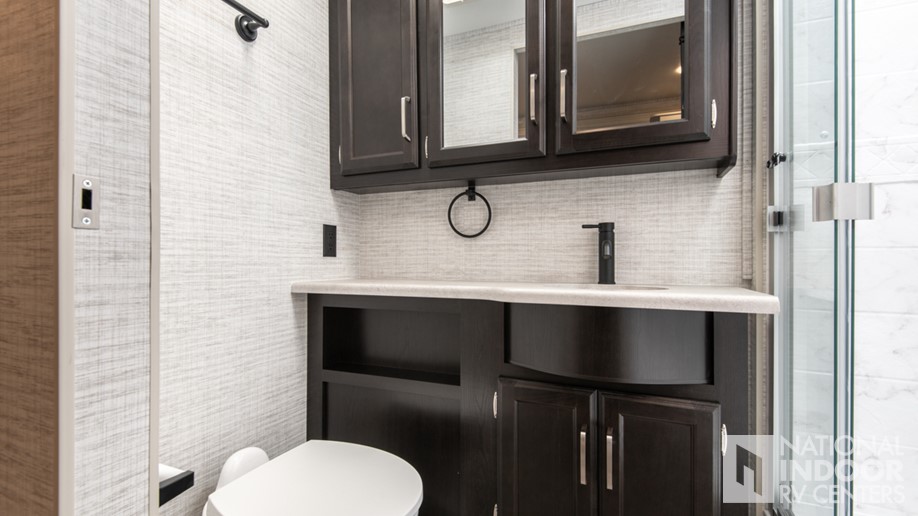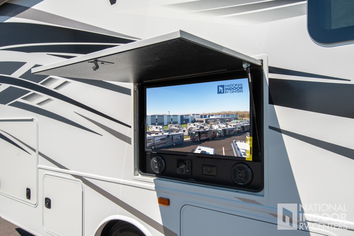 E-Z Drive™; Exterior entertainment center with outside speakers and LED HD Smart TV mounted on swivel bracket; Electric patio awning with LED lights; Slideout cover awnings; 1,000W inverter; Sony® infotainment center with Apple CarPlay® and Android Auto™; Backup and side-view cameras; Removable driver/passenger cockpit table; LED HD Smart TV in living area; Blackout night roller shades