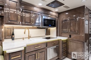 Bar area with beverage chiller and rain glass upper cabinet door with LED accent lighting (45R only)