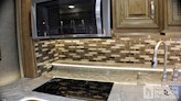 | Porcelain tile backsplash with glass design inlays |