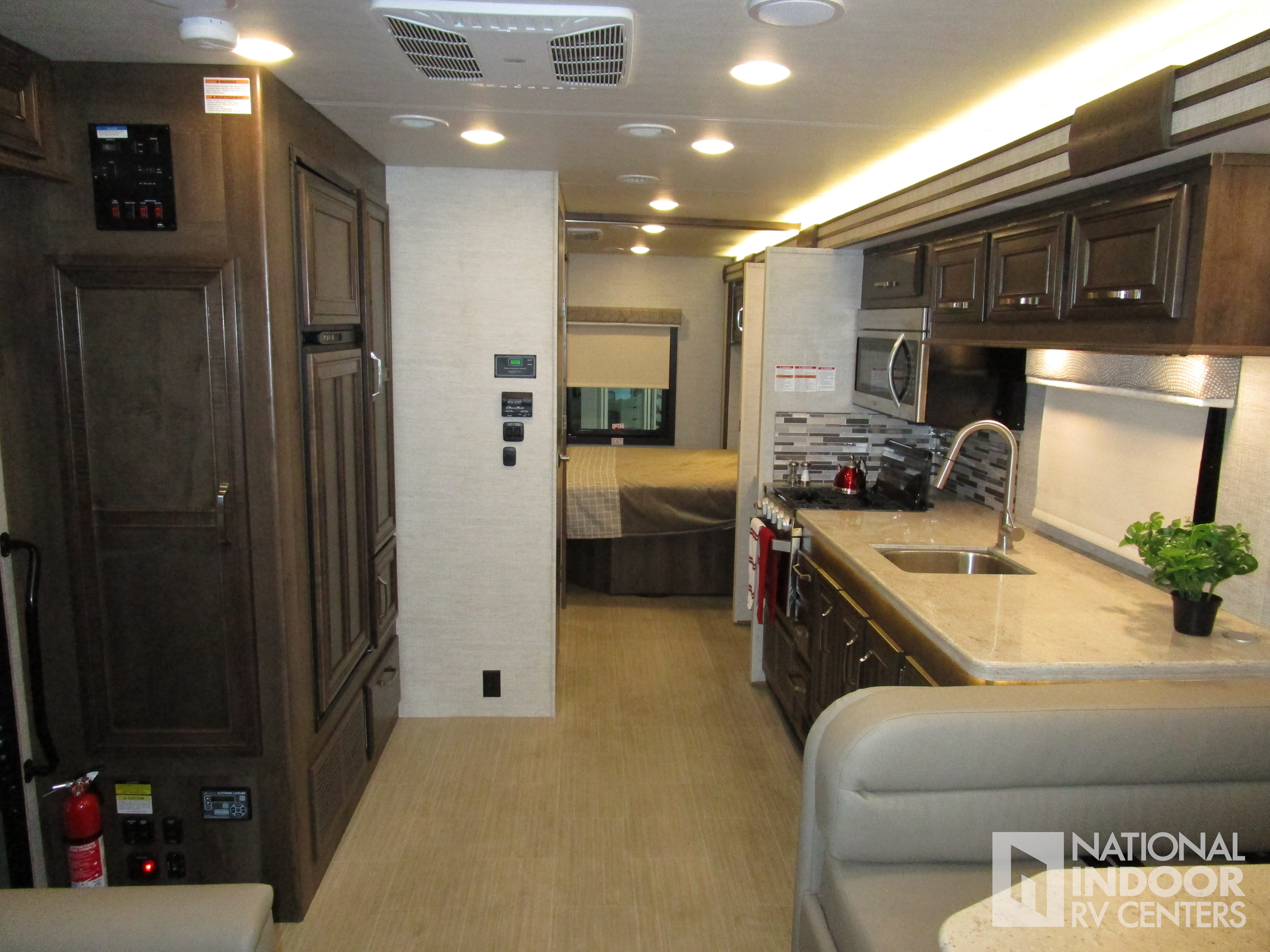 1,000-watt inverter, chrome heated remote-controlled side-view mirrors, Sony infotainment center with Apple CarPlay and Android Auto, backup and side-view cameras, LED-lit solid-surface kitchen countertops and LED TV in bedroom