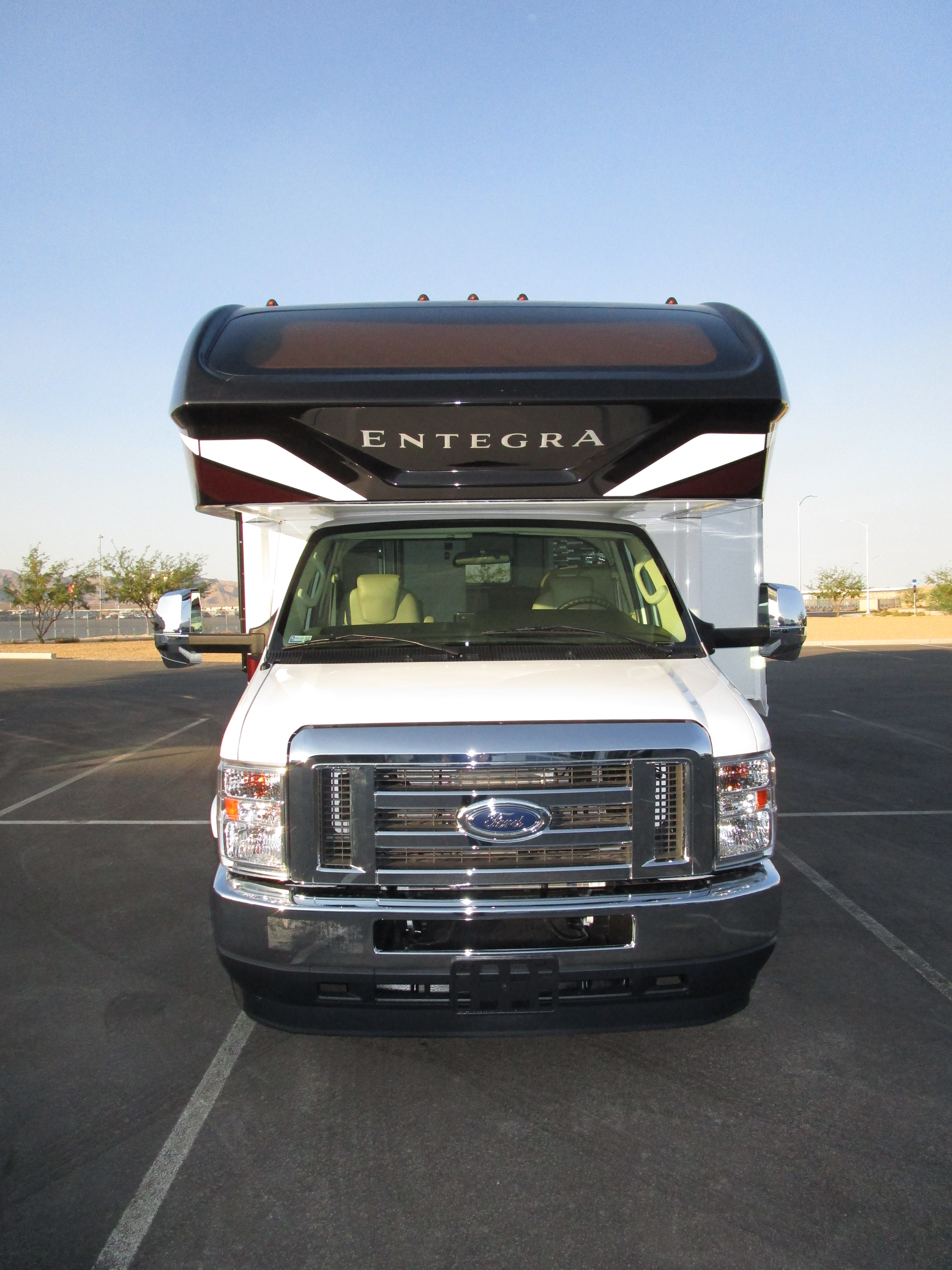 EZ-Drive Elite, once-piece seamless fiberglass front cap, automotive-bonded panoramic window in front cap with power shade, automatic hydraulic leveling jacks, frameless windows, electric patio awning with LED lights, exterior LED TV with high-output marine-grade exterior speakers